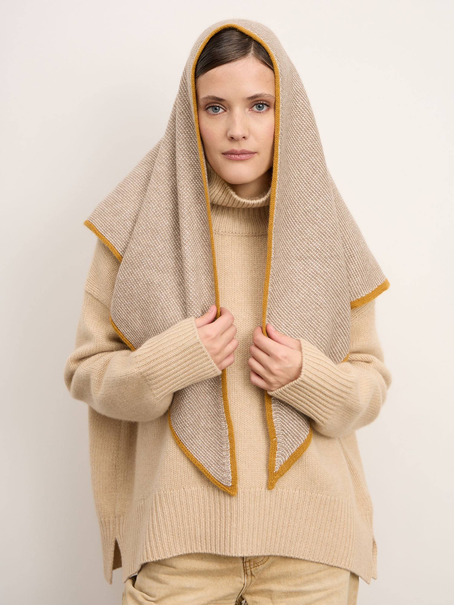 Косынка из кашемира в оттенке капучино с золотистой окантовкой — это сочетание традиции и современности, которое придаёт каждому образу лёгкость, теплоту и неповторимую изысканность.