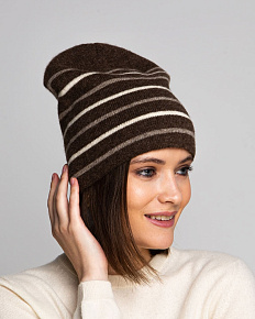 Красивая темно-коричневая шапка с полосками. которые ее очень украшают. |