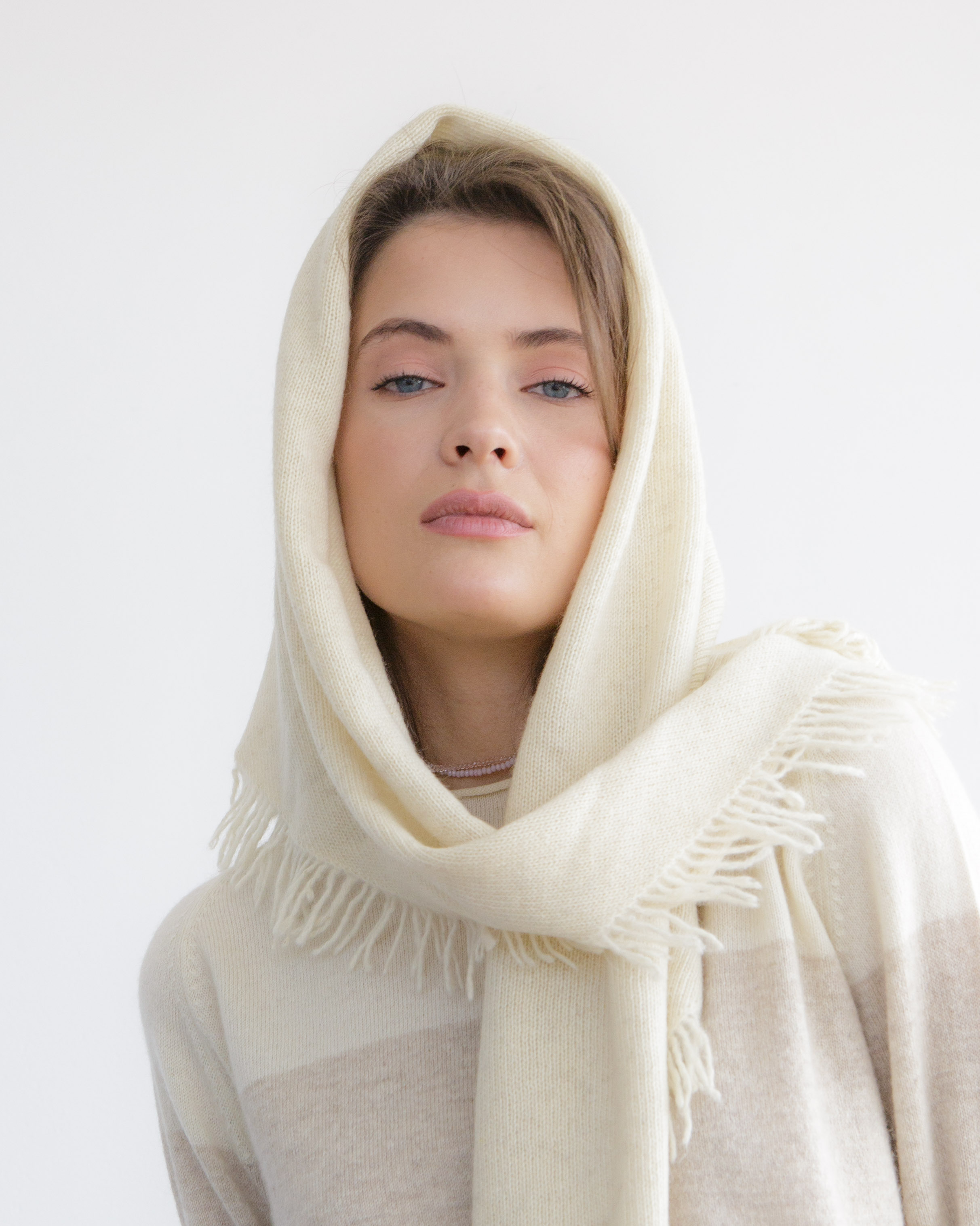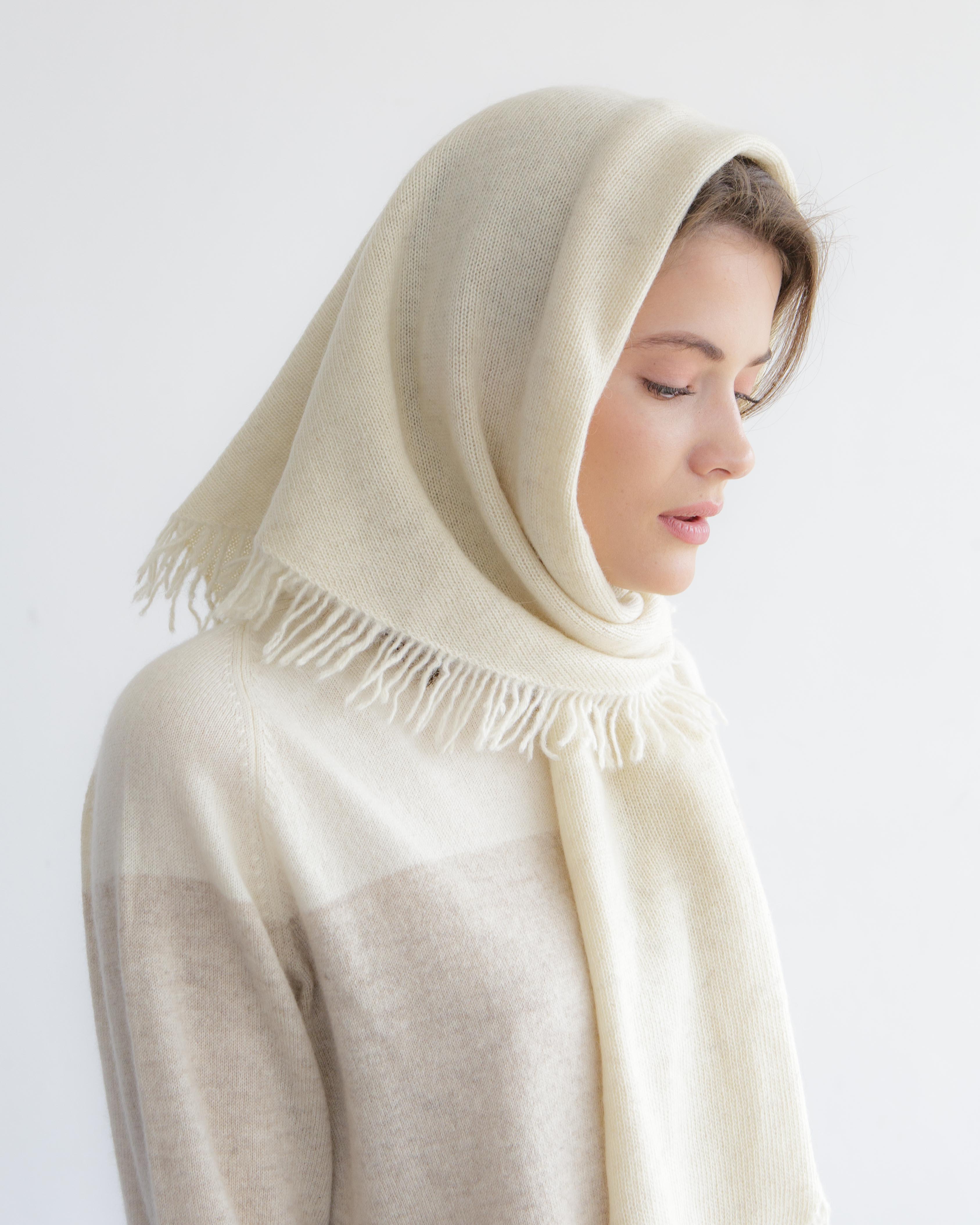 Шикарная косынка, цвет грязно-белый. Немного колется, но зато теплая. |