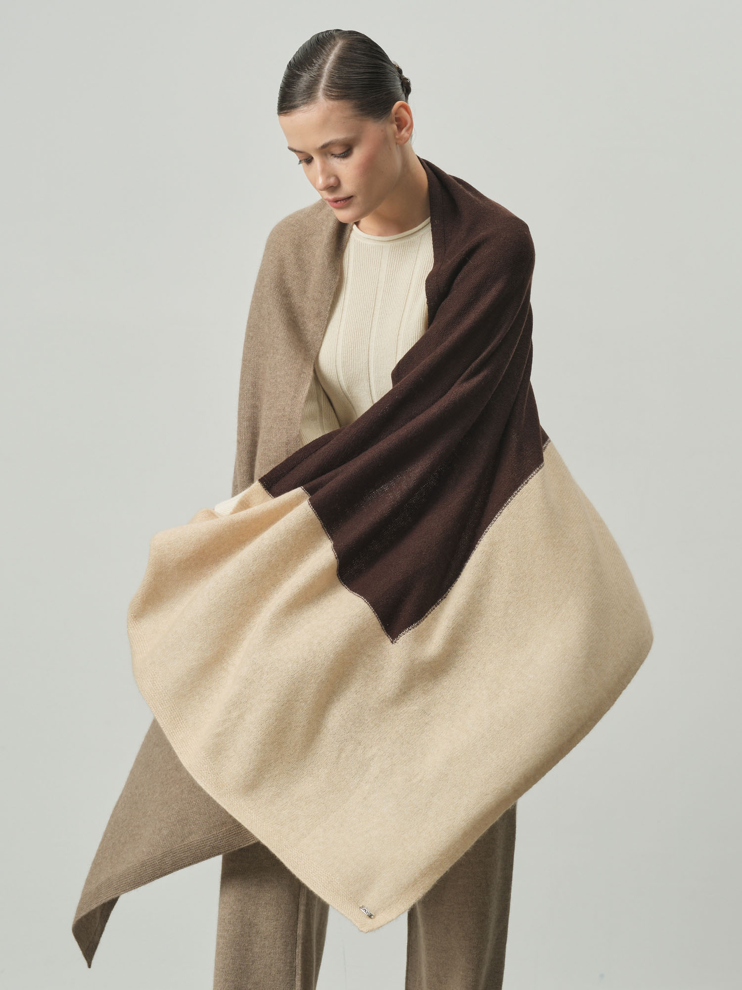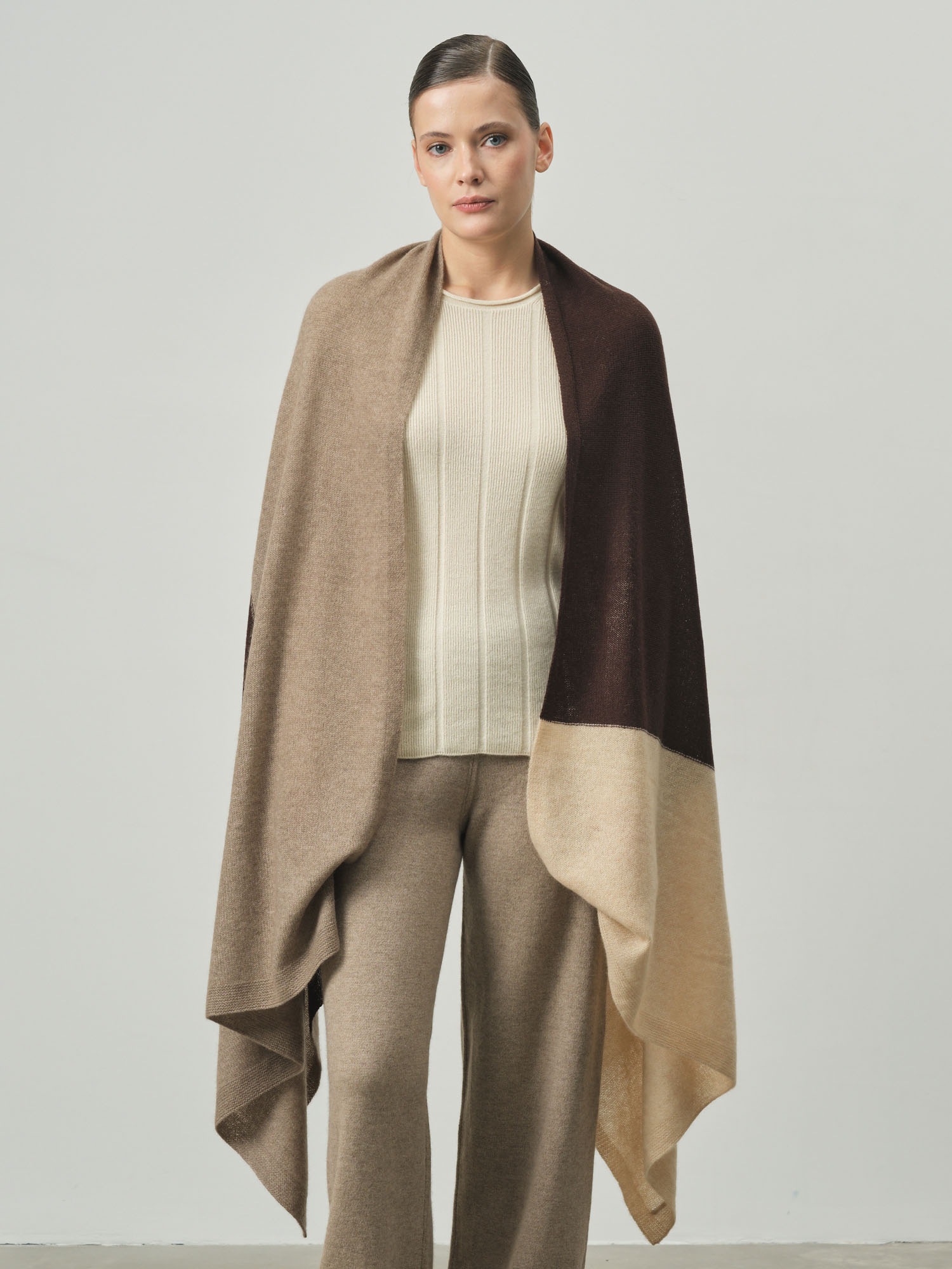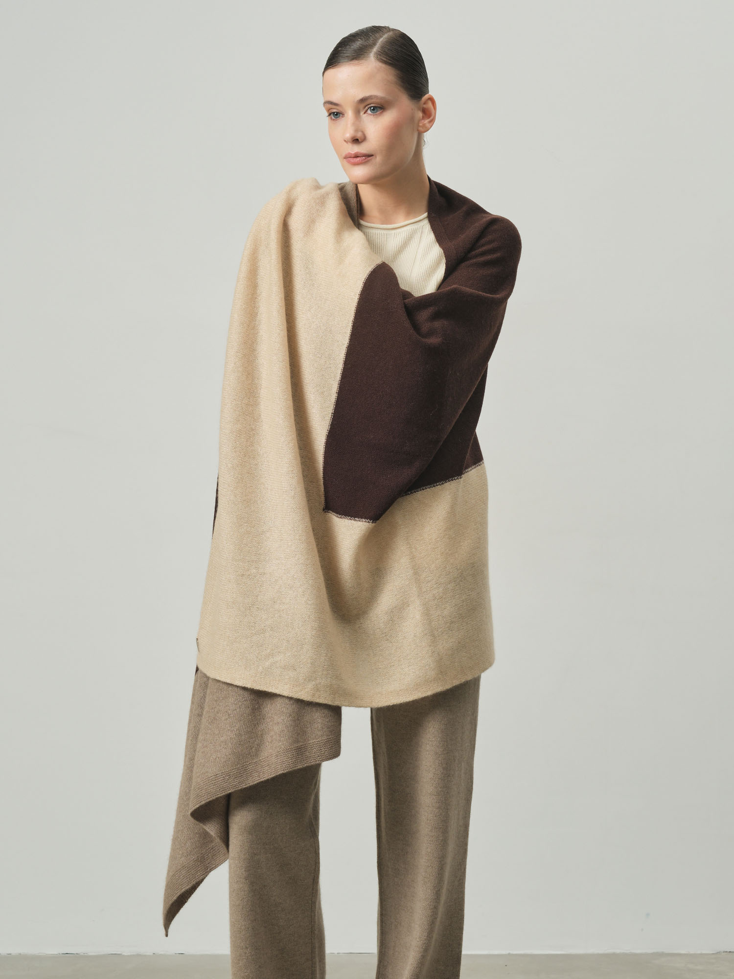 Роскошный палантин! 100% кашемир сразу чувствуется - невероятно мягкий и нежный. Шоколадный цвет просто восхитительный, очень благородный оттенок. Можно носить как шарф или накидку. |