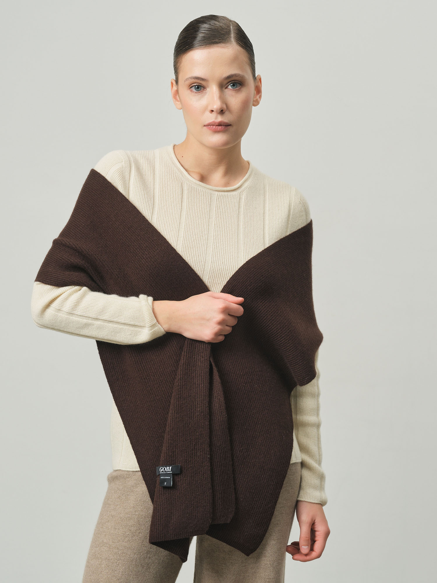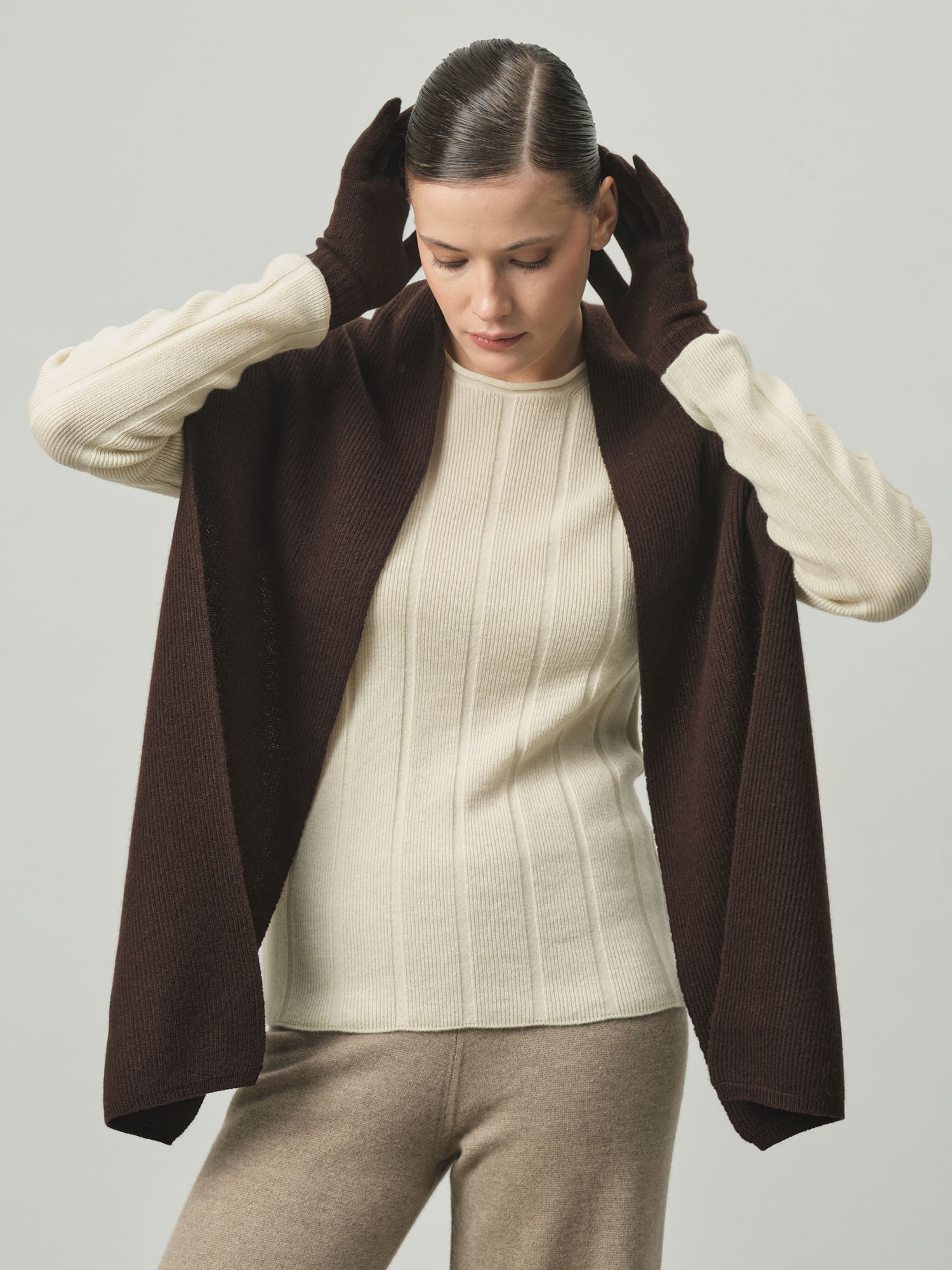 Мой первый кашемировый шарф, и я влюбилась! Шоколадный цвет универсальный, ношу с бежевым пальто – смотрится шикарно. |
