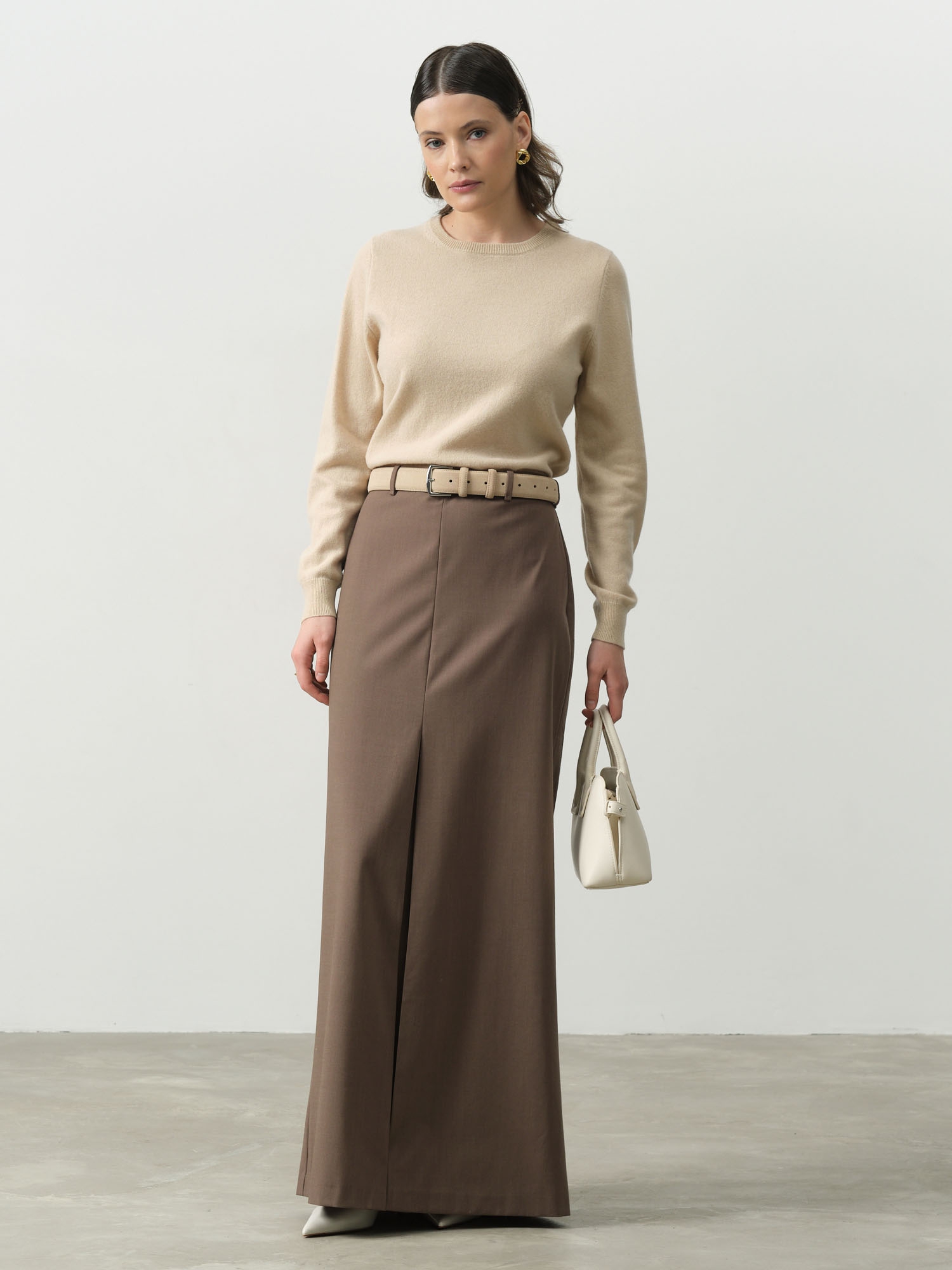 Бежевый оттенок теплого подтона делает этот джемпер универсальным компаньоном для любых сочетаний – от строгих офисных ансамблей с юбками-карандаш до расслабленных weekend-луков с денимом. Классический крой с умеренно свободной посадкой подчеркивает силуэт, сохраняя элегантную непринужденность. Аккуратная горловина и лаконичные линии делают модель особенно практичной для многослойности.