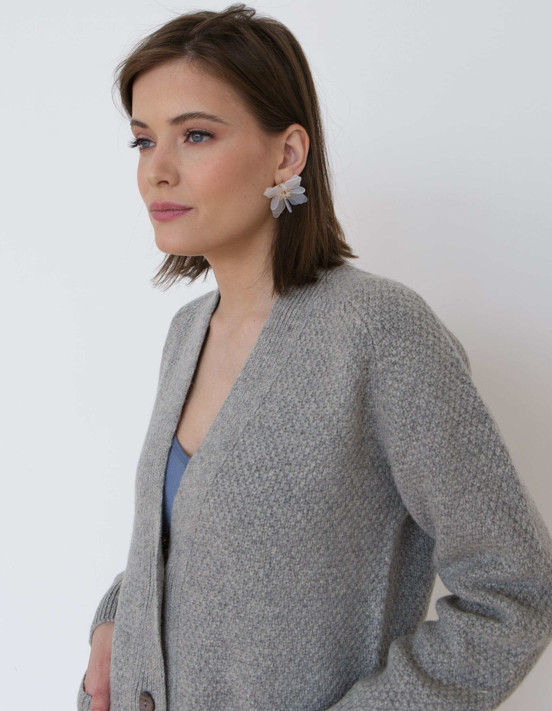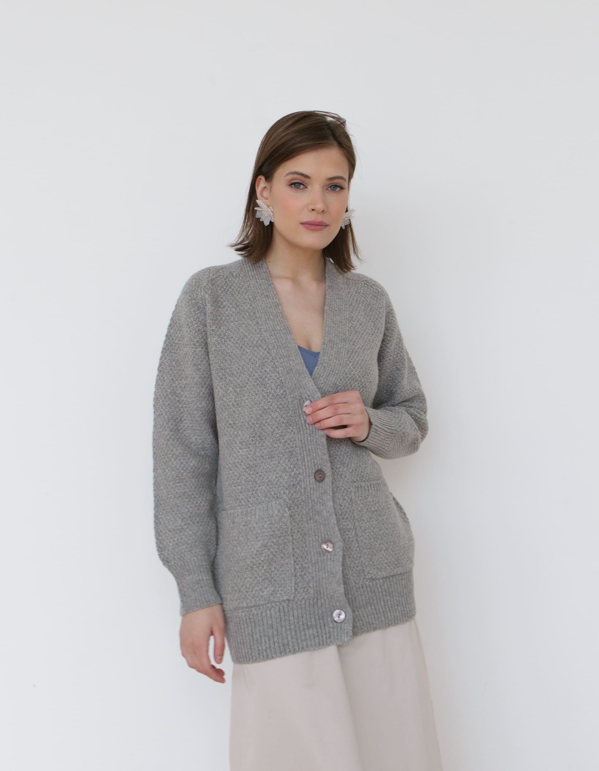 Модель выполнена в функциональном дизайне с глубокими вместительными карманами, добавляющими практичности повседневному образу. Прямой силуэт свободного кроя обеспечивает удобство движений и подходит для различных типов фигуры. Серый цвет делает кардиган универсальным базовым элементом, который легко сочетается с другими предметами гардероба независимо от их цветовой гаммы.