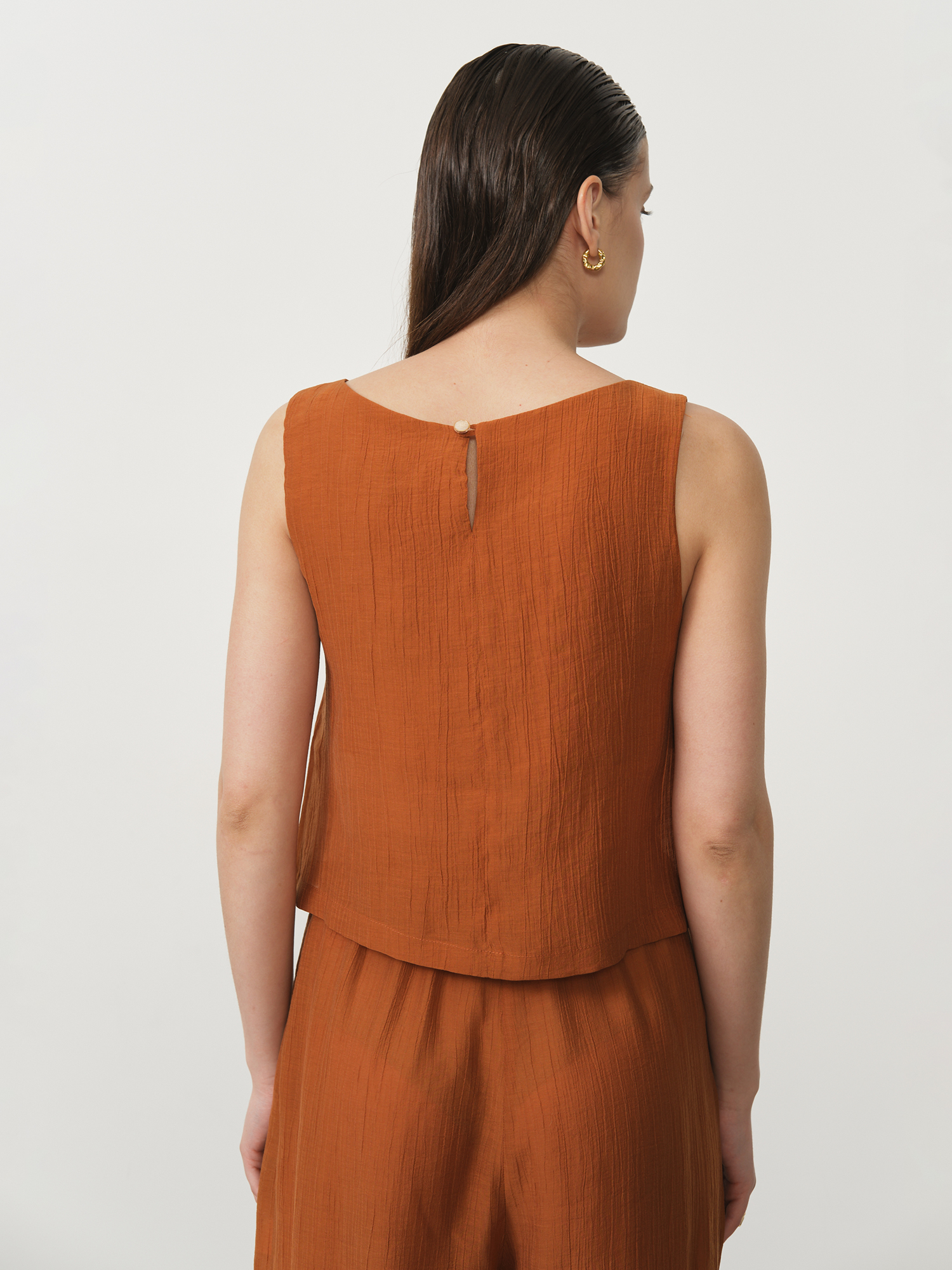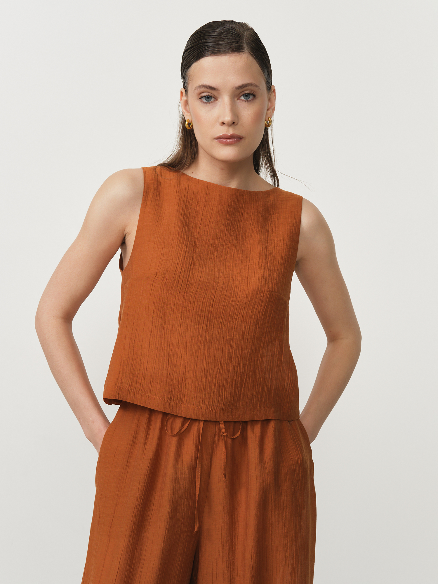 Прямой свободный силуэт без рукавов. Минималистичный крой делает модель универсальной и легко сочетаемой.
