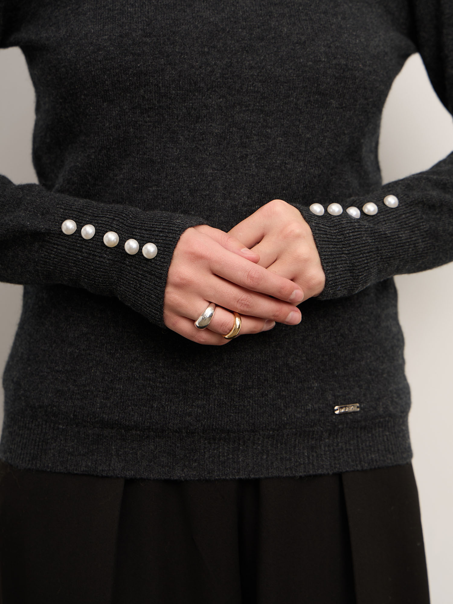 Джемпер выполнен в минималистичном крое с округлым вырезом и длинными рукавами. Акцент — изысканные декоративные пуговицы на манжетах, которые добавляют образу изящность и индивидуальность. Манжеты и нижняя резинка держат форму и подчёркивают аккуратную посадку изделия.