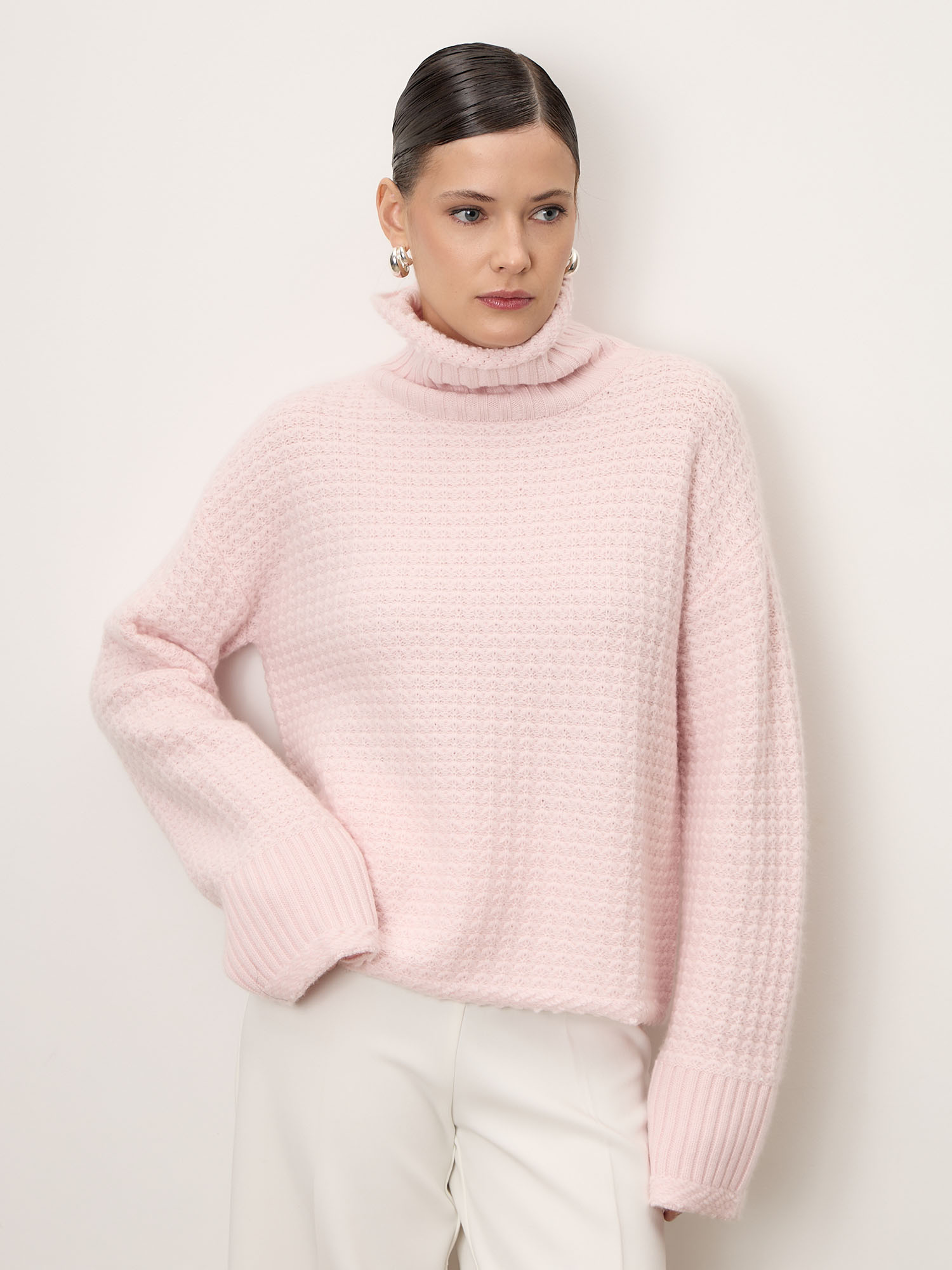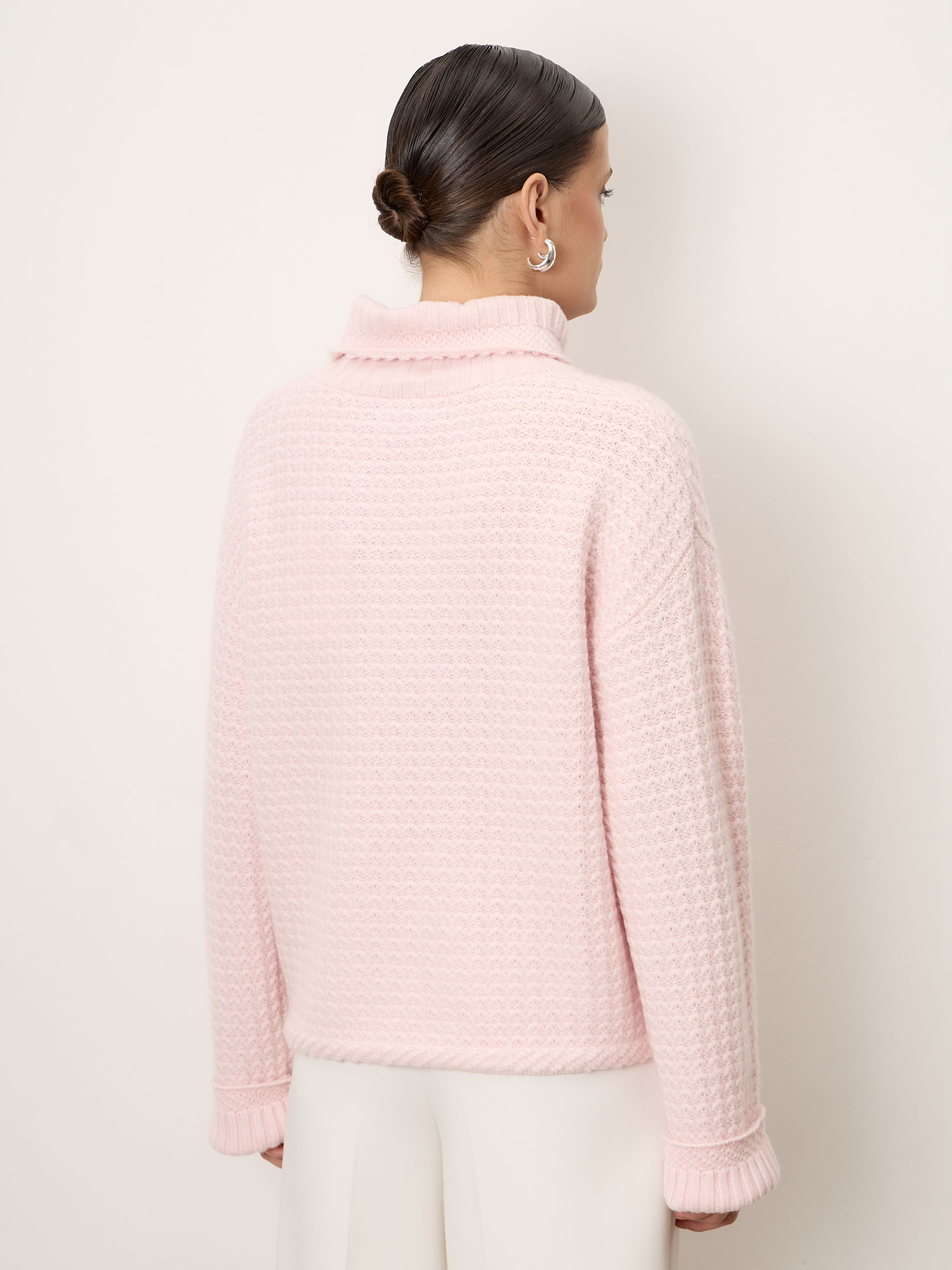 Этот свитер — воплощение мягкости и нежного уюта. Он окутывает тело тёплым облаком, делая каждый день чуть спокойнее и светлее. Розовый оттенок подчёркивает женственность и свежесть образа, а выразительная фактура кашемира создаёт ощущение премиальности на первый взгляд.