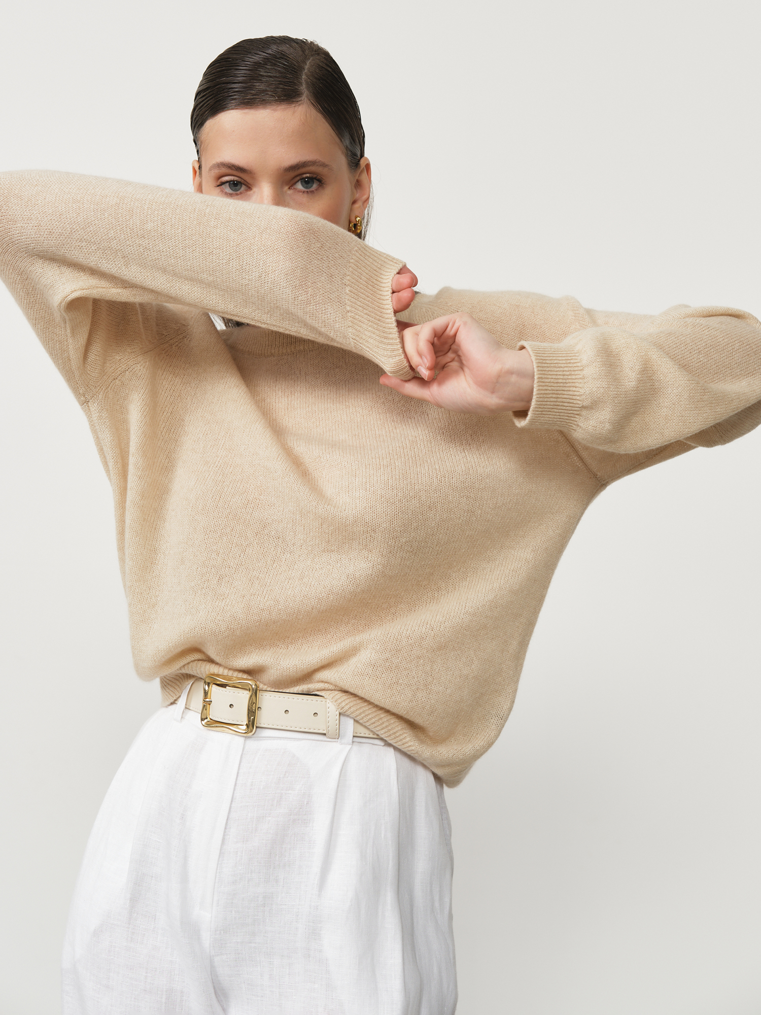 Классический крой с круглой горловиной обеспечивает идеальную посадку по фигуре, не стесняя движений. Безупречная, равномерная вязка создает эффект шелковистой гладкости и подчеркивает премиальный характер изделия. Бежевый оттенок — воплощение тонкого вкуса и элегантности, легко интегрируется в любой гардероб и стилистические направления.