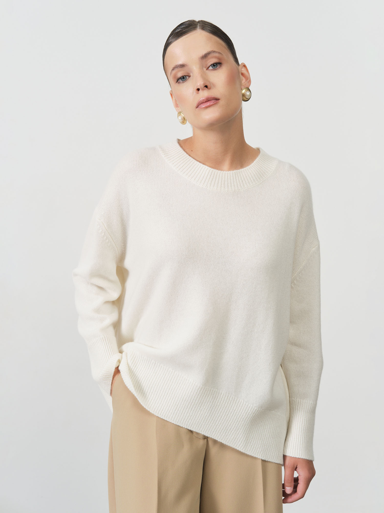 Изысканный кашемировый джемпер свободного кроя в мягком кремовом тоне представляет собой идеальное воплощение элегантности и практичности. Премиальный кашемир 100% состава демонстрирует исключительные характеристики: деликатную мягкость, эффективную терморегуляцию и превосходную воздухопроницаемость. Материал создает приятные тактильные ощущения и обеспечивает оптимальный тепловой баланс.