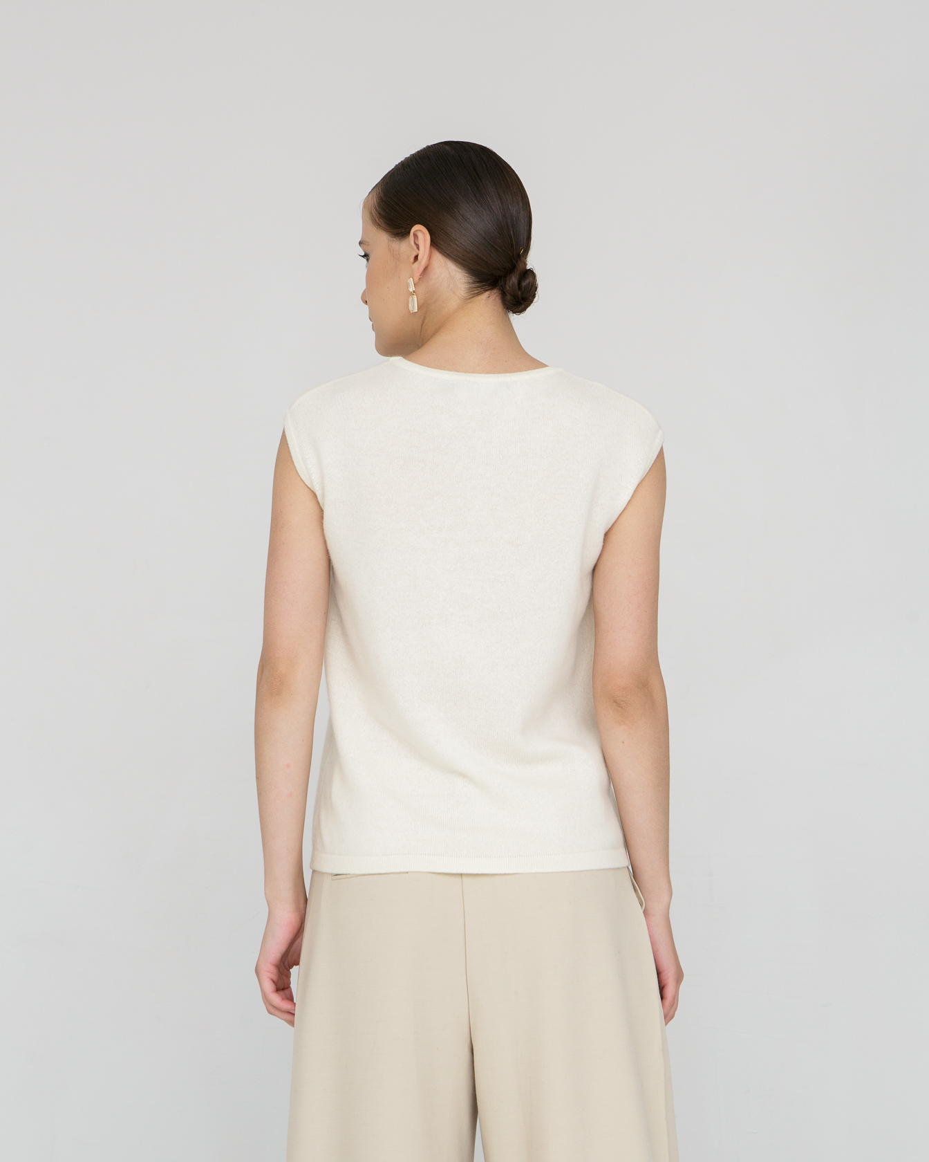 Безрукавный крой с круглым вырезом делает джемпер идеальным для layering-стиля. Сливочный оттенок — нейтральная база, которая гармонично дополняет любые цветовые решения. Прямой силуэт подходит разным типам фигуры.