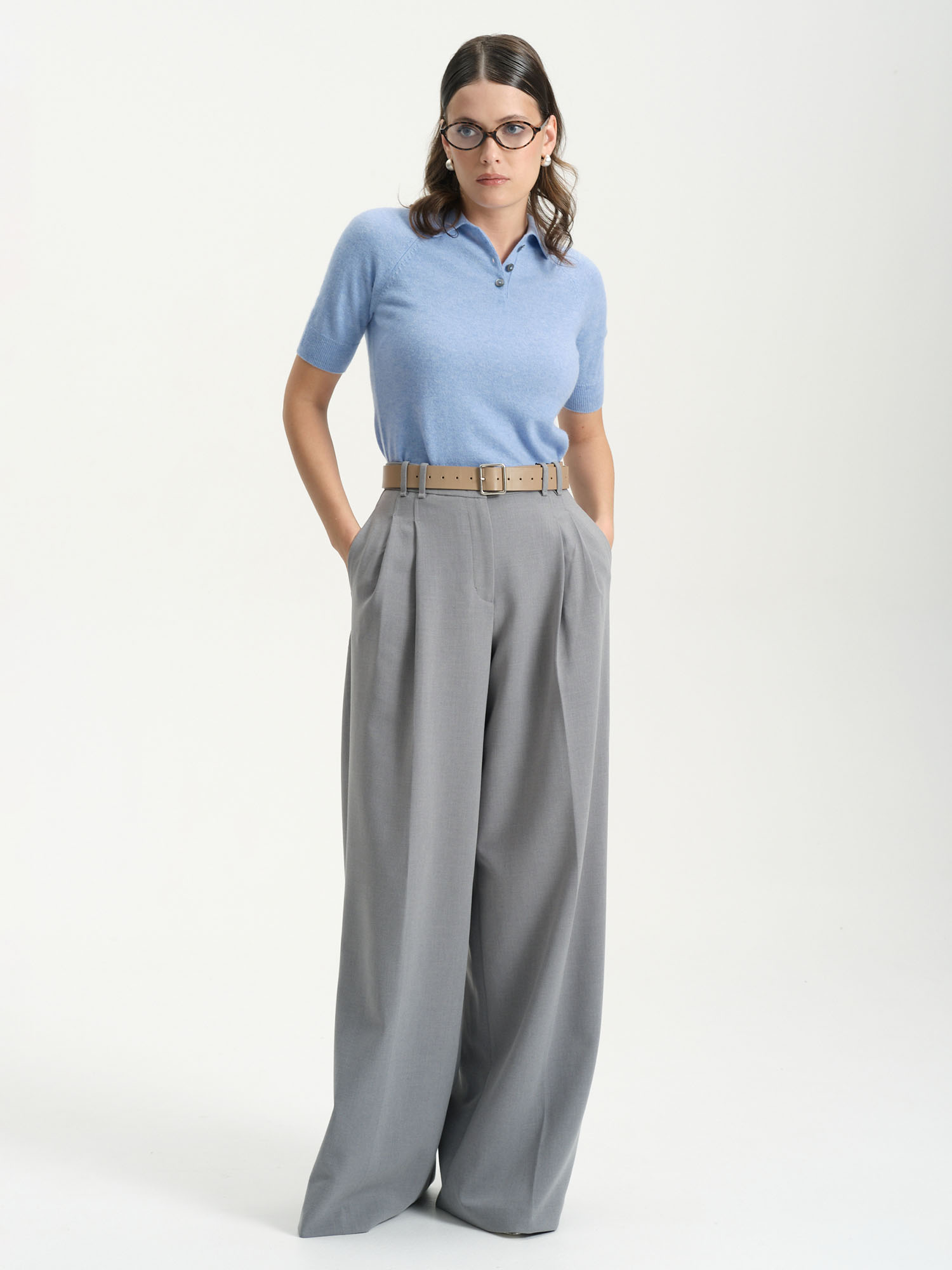 Классический джемпер-поло с коротким рукавом, аккуратным воротником и застёжкой на пуговицы. Прямой силуэт обеспечивает комфортную посадку и универсальность.