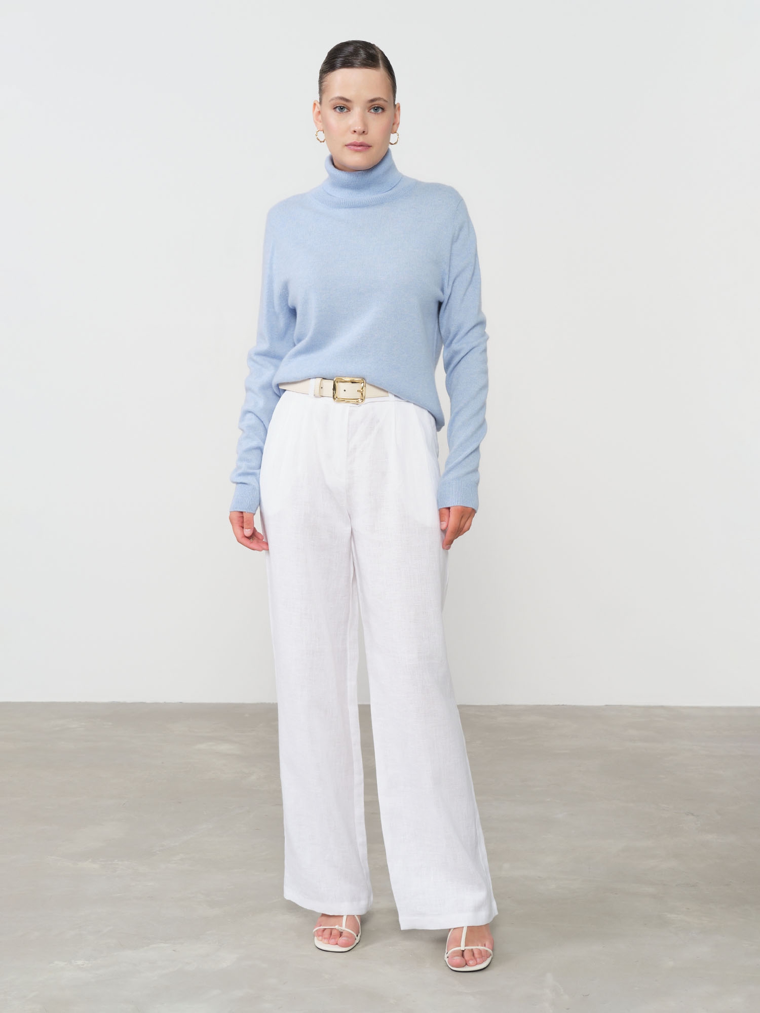 Нежный голубой цвет создает ощущение свежести и легко сочетается с различными элементами гардероба, будь то классические брюки, юбка или джинсы. Эта водолазка станет идеальным дополнением как для повседневного, так и для более официального стиля, добавляя нотку роскоши в ваш образ.
