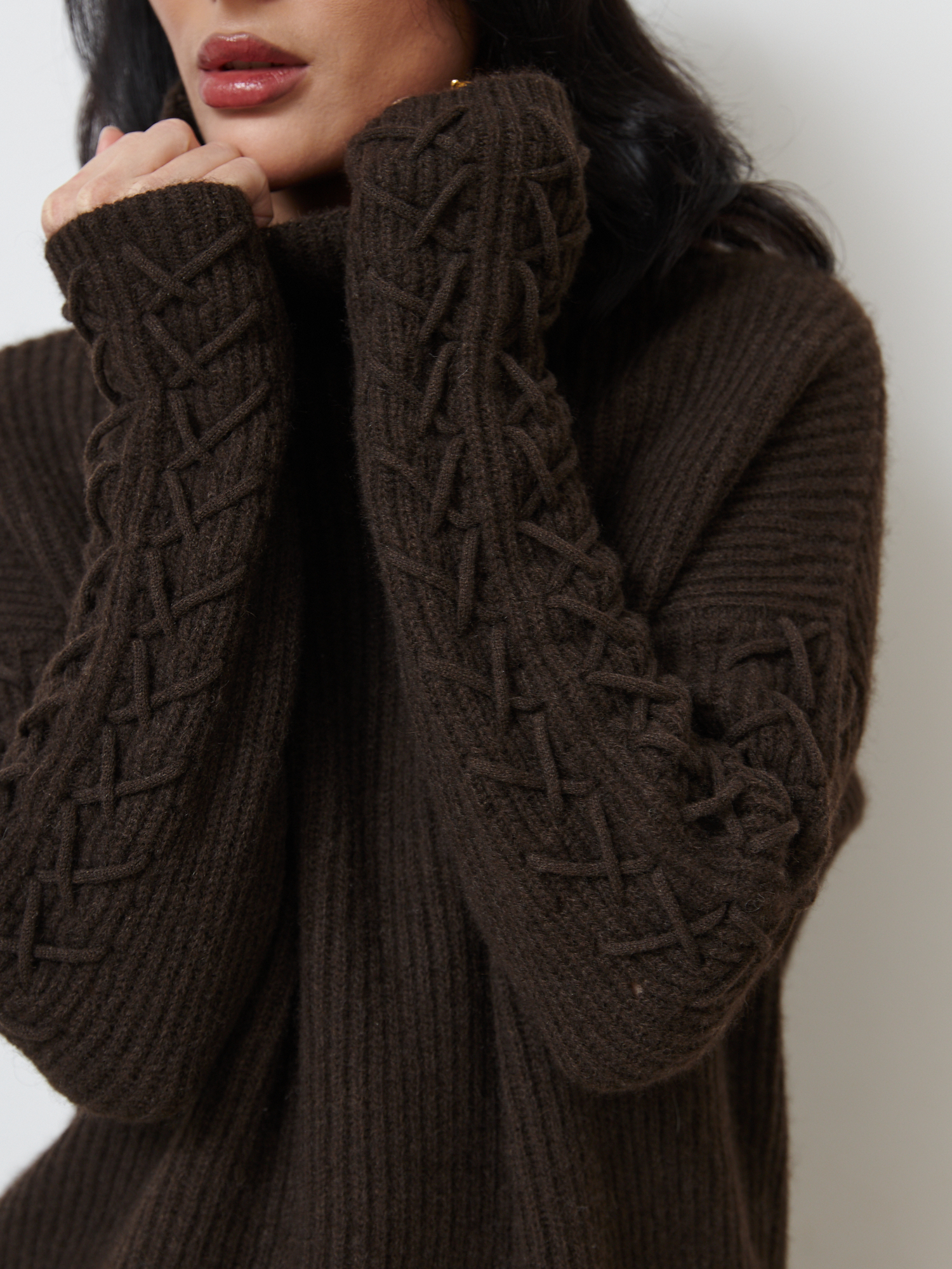 Высокий воротник-стойка, фактурная вязка и декоративные элементы на рукавах создают выразительный и благородный образ.