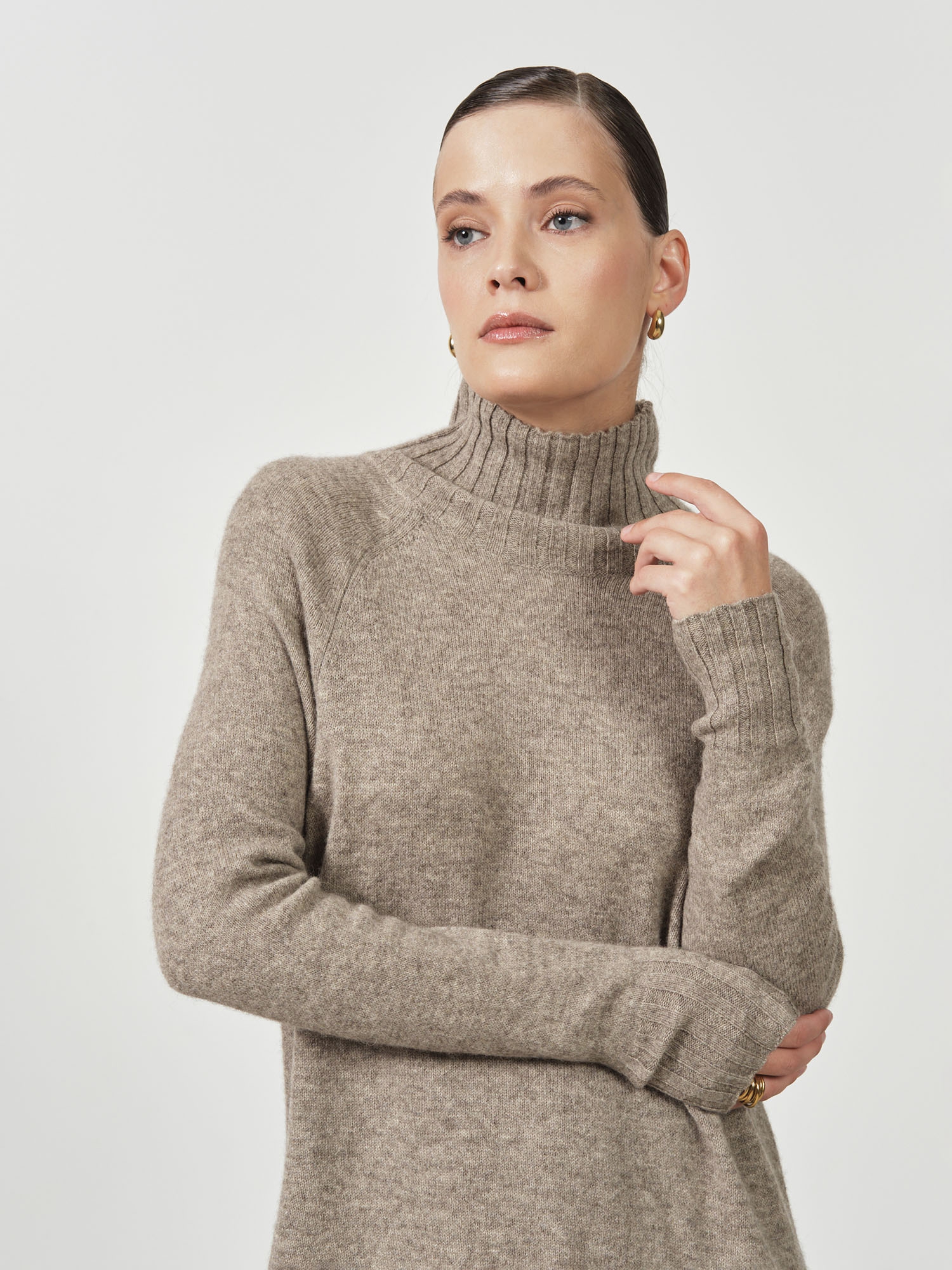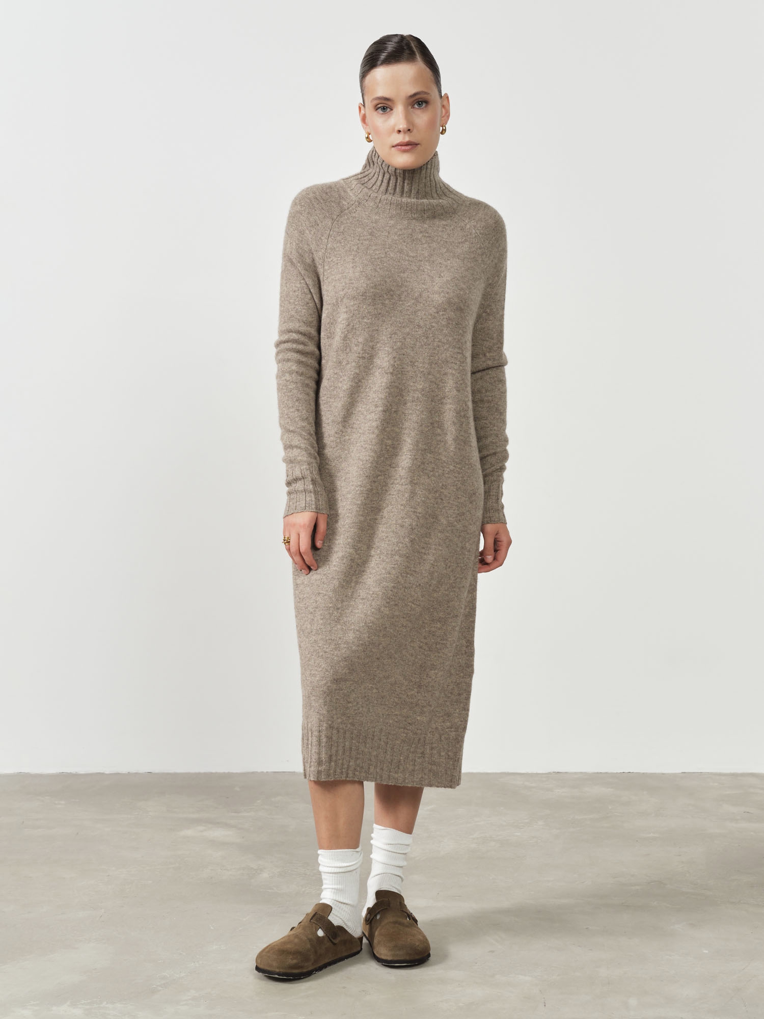 Платье из пуха яка с воротником стойкой в серо-бежевом цвете — это идеальный выбор для холодного времени года. Выполненное из натурального пуха яка, оно обладает исключительной мягкостью и способностью сохранять тепло, обеспечивая комфорт даже в самые морозные дни.