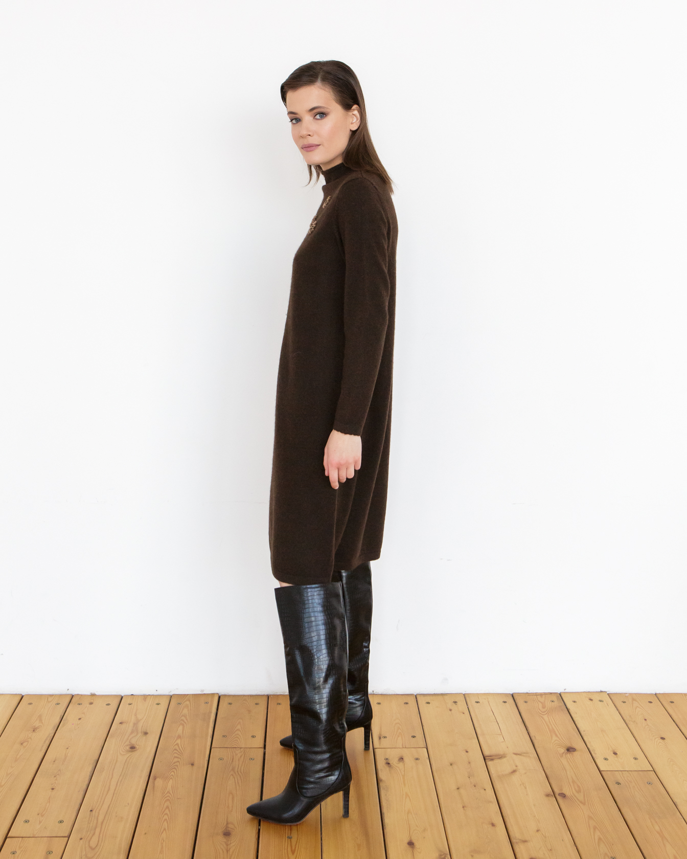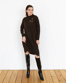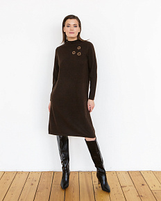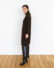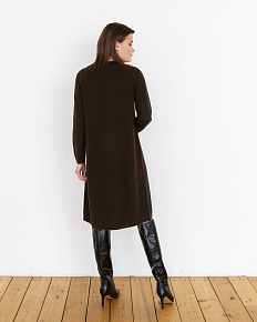 Изящное платье из пуха яка в темно-коричневом цвете станет отличным дополнением вашего гардероба. Модель с длинными рукавами и минималистичным дизайном идеально подходит для создания как повседневных, так и более нарядных образов. Высокий воротник и плотная вязка обеспечивают тепло и комфорт, делая это платье идеальным выбором для прохладных дней.