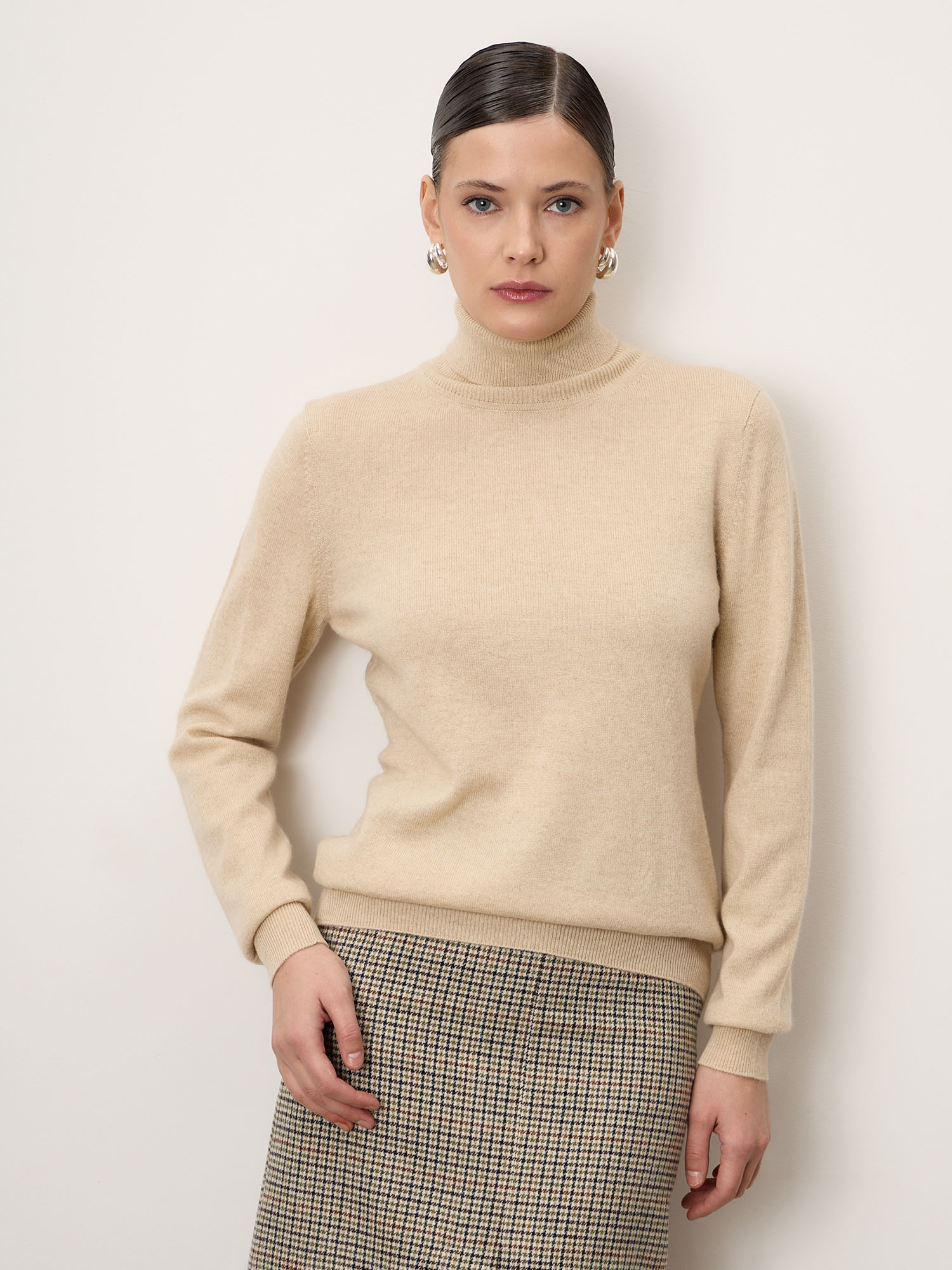 Бежевая водолазка из чистого кашемира — это базовая вещь класса люкс. Она долговечна, универсальна и легко вписывается в любой капсульный гардероб, подчёркивая вкус и статус своей обладательницы.