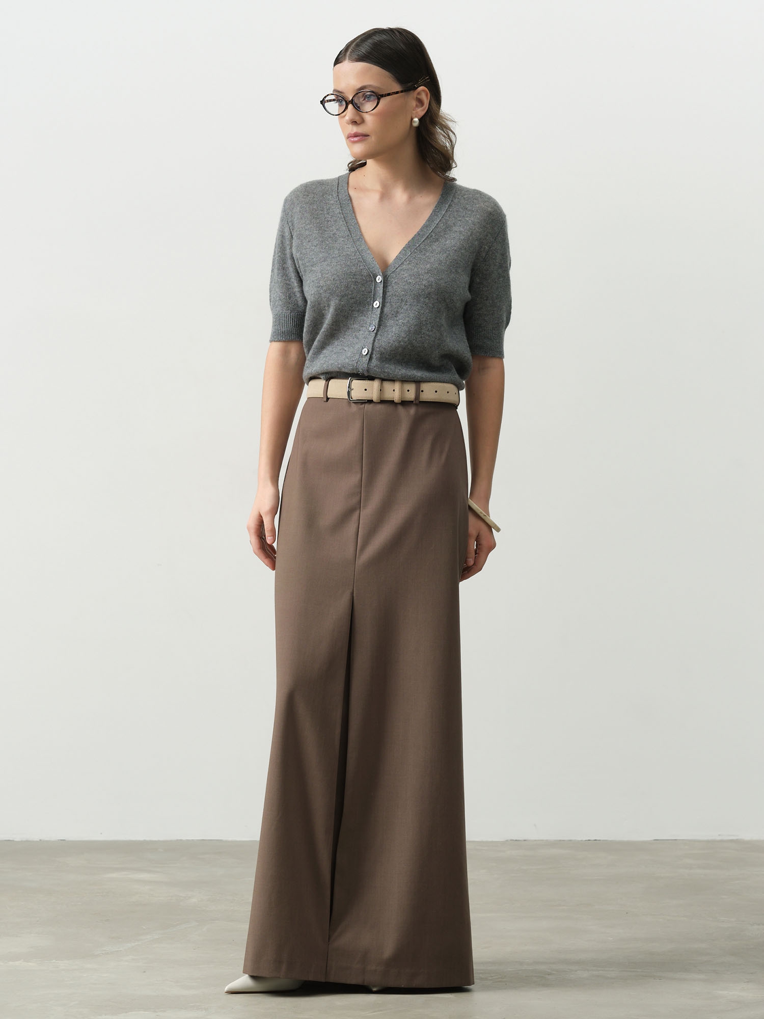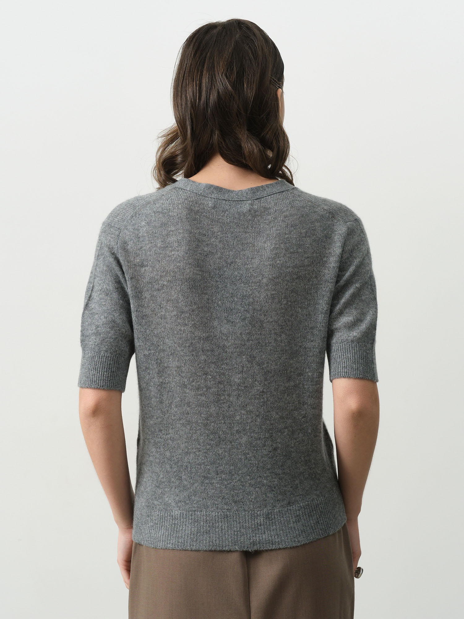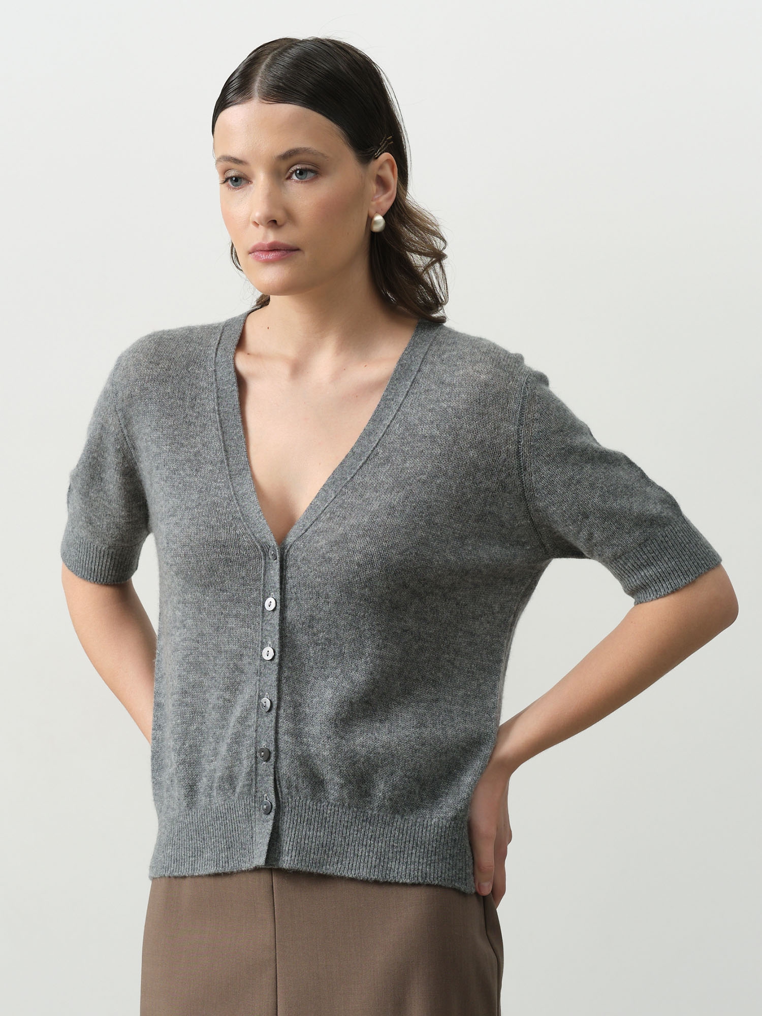 Лаконичный дизайн кардигана графитового цвета представляет собой безупречное сочетание классики и современности. Продуманный крой подчеркивает достоинства фигуры, создавая элегантный силуэт.