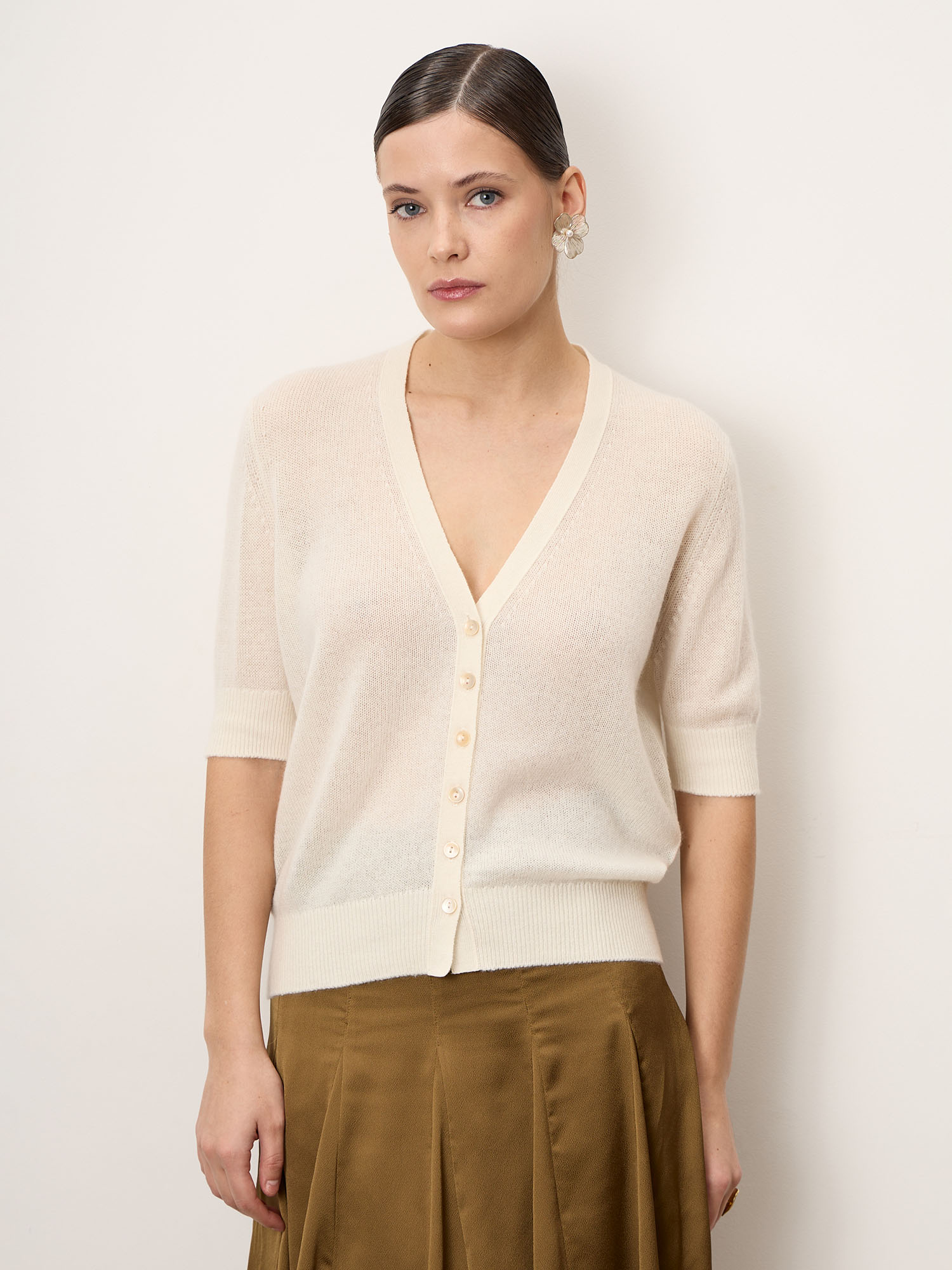 Классический кардиган с V-образным вырезом и застёжкой на пуговицы, короткий рукав, аккуратная вязка и лаконичный силуэт.